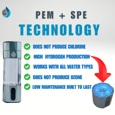 SPE/PEM technology ensures the safety and efficiency of hydrogen water bottles by separating hydrogen from oxygen during electrolysis. SPE blocks impurities, while PEM allows only pure hydrogen ions, preventing by-products like chlorine when using filtered water. This technology delivers clean, hydrogen-rich water.